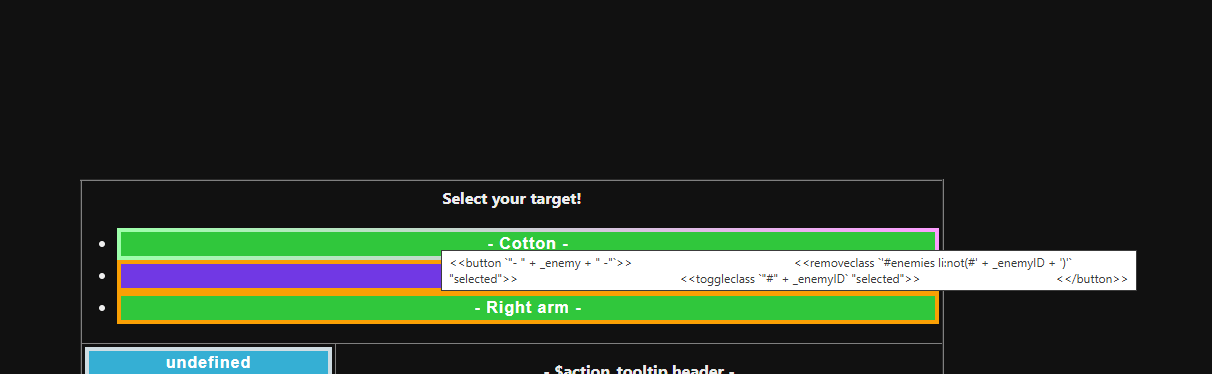 <<set _enemies to ["Cotton", "Left arm", "Right arm"]>>