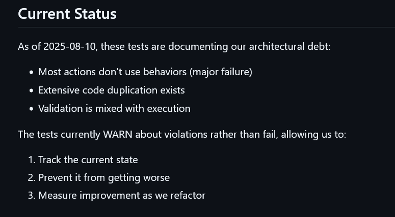The duplication of action code was 100% on me. I had designed the behaviors in world model and then was a little absent-minded about it. Admittedly this is a pattern when using LLMs. You can have it very quickly write swaths of code, but if you’re not paying attention, it will do something off the rails. As mentioned in the blog, this is when we introduced architecture structure tests to prevent a similar failure.