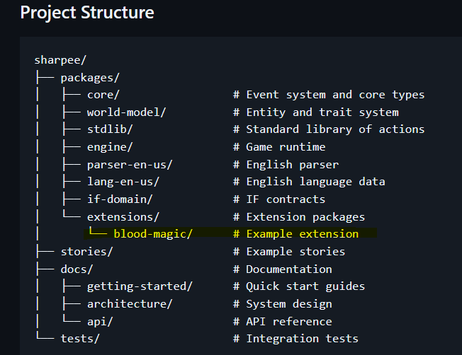 It’s raw. It’s so raw, the README references git clone https://github.com/your-org/ instead of a real project. The “Create your first interactive fiction in minutes” part is not here yet, and “For Developers” instructions don’t work:
