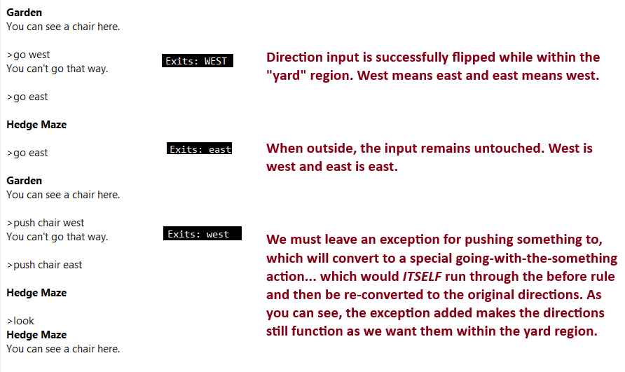 I have a region in my game that flips all the east-west directions when you move through two rooms. It’s a reference to Trinity and it has a large in-game puzzle connected to it. Now, how would I make all easts become wests, and all wests become easts (and then, from that, I could do northwest-northeast and southwest-southeast). I can do all text description changes, but the actual direction changes? Is there an easy way that I can do this? (And even better, to a specific region but not the whole game?)