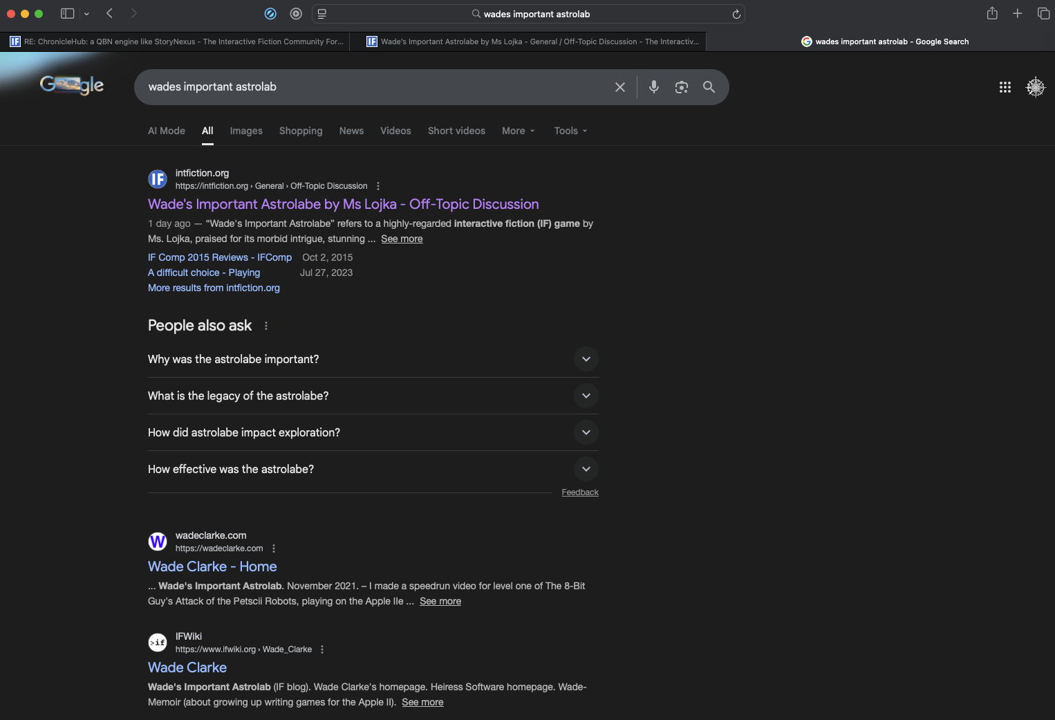 OMG! At result 9 I found a link to my review of ‘Confessing to a Witch’, on IFDB, which erroneously uses the text Wade’s Important AstrolabE!