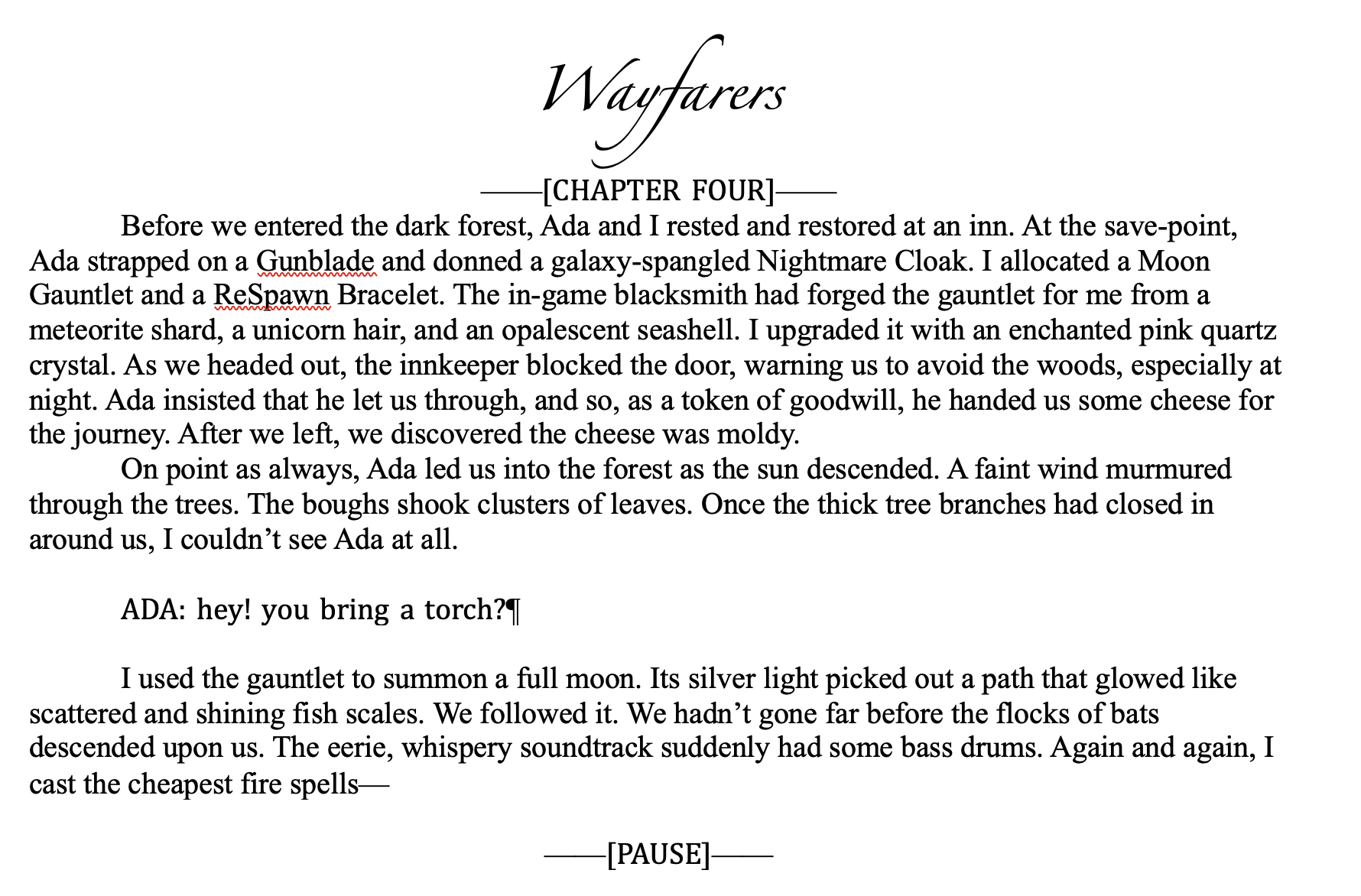 Wayfarers was my first Twine game. I initially wrote it as a creative writing assignment way back in 2013, and I never got over the uneasy feeling that a straight-forward text was not the right format. My first readers were not gamers and were largely confused by it, to be honest. They most resisted the fact that we were starting in medias res with Chapter Four. But that was my favorite part!