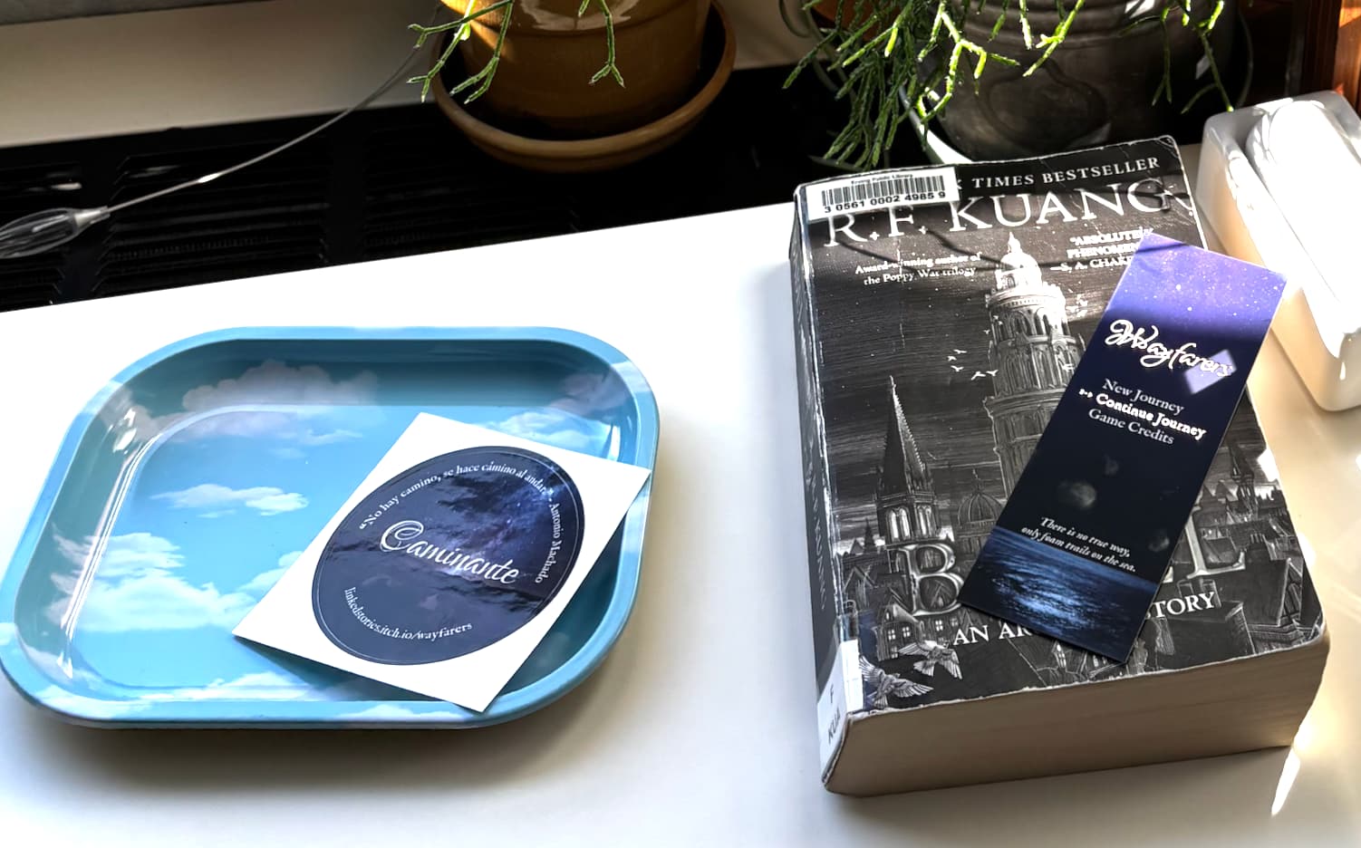 I created some Wayfarers swag as a design experiment - a bookmark and vinyl sticker. Here is a pic my beta reader/player snapped of hers:
