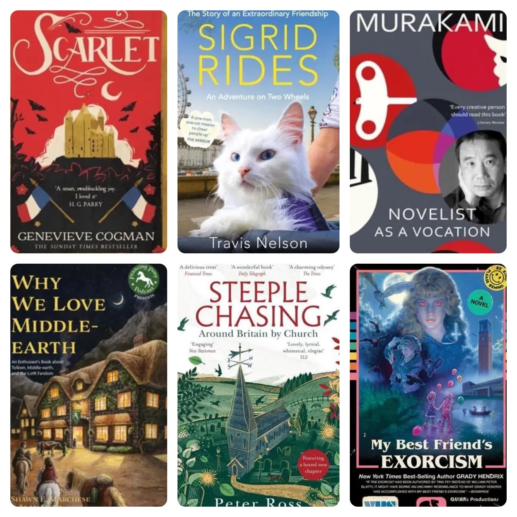 Picture showing 6 book covers. On the top row Scarlet by Genevieve Cogman, Sigrid Rides by Travis Nelson, Novelist as a Vocation by Haruki Murakami, then below that Why We Love Middle-Earth by Marchese and Sisto, Steeple Chasing by Peter Ross, and My Best Friend’s Exorcism by Grady Hendrix. Many varied cover designs.