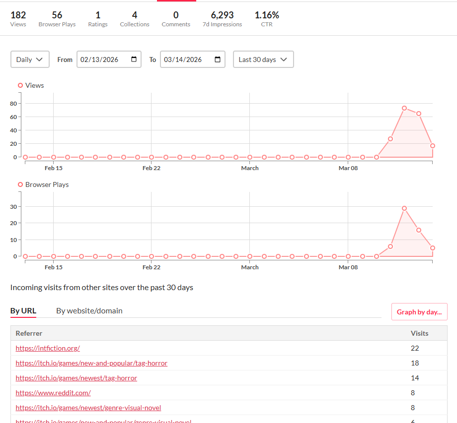 Most projects get very very little attention — 182 views is normal for the average game released on Itch, might even be on the high end — and a few lucky ones will go viral and get thousands of views, or tens of thousands, or even hundreds of thousands. Maybe you’ll win that lottery and a popular Youtuber will make a video about your thing and thousands of people will see it. Then for an indie game, you can spin that attention into hype for the larger, full, updated version of your small free game that will be released on Steam as a commercial product in a few months. It seems like a lot of popular indie games on Steam achieved attention and an audience via this route. But it is highly likely that the average small project, no matter how much time has been put into it, won’t get that much traction.