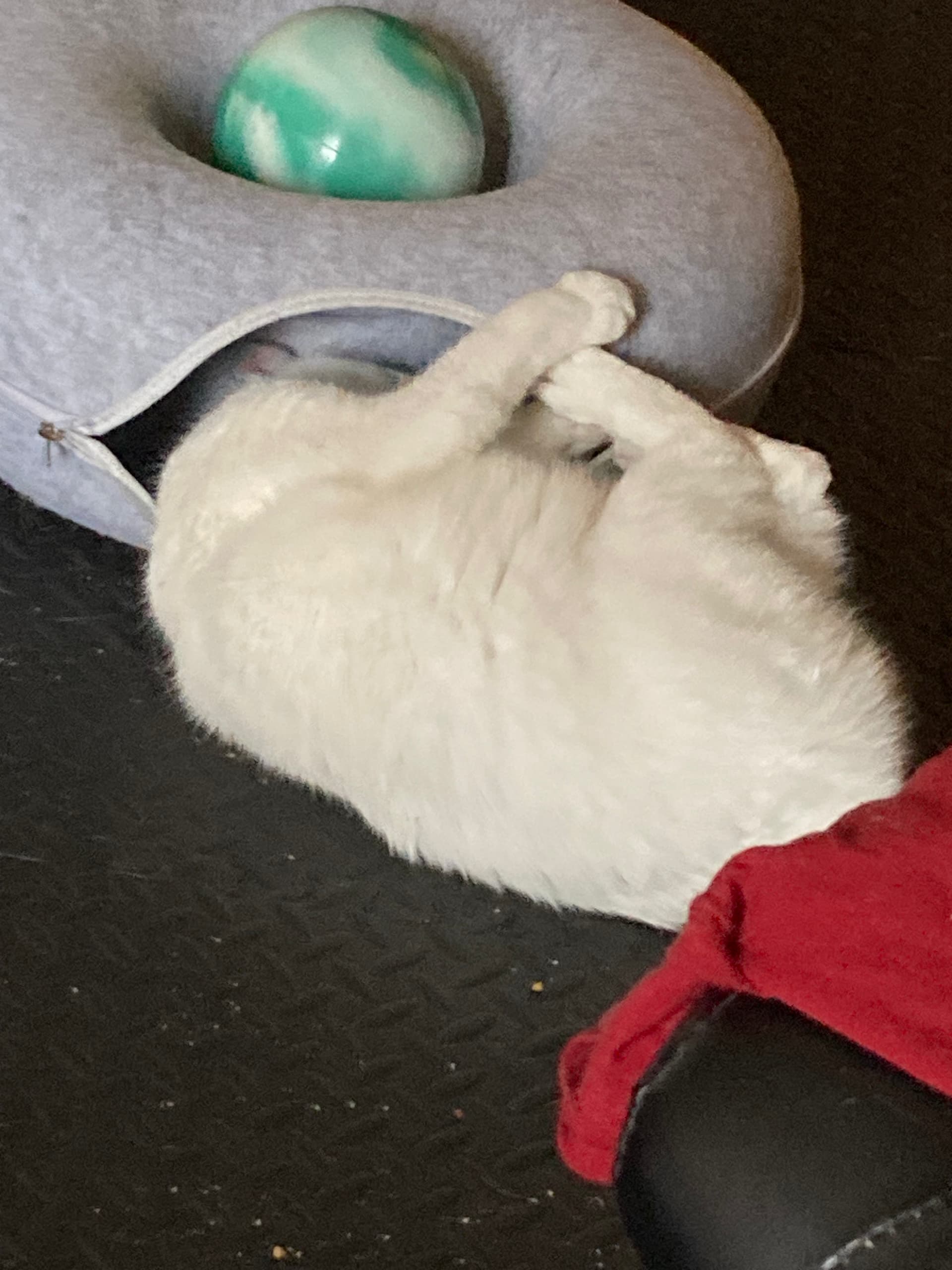 I got the cats a donut tunnel, and I’m trying to get my fluffy-clawed angel to drag herself all the way through it as recompense for not shredding the couch.