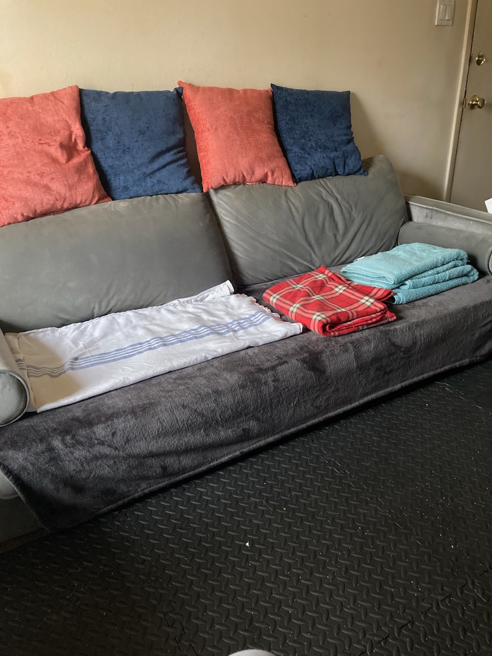 I cleared the couch, vacuumed everything thoroughly, tipped it and removed the legs. Now it sits flush on the floor and it’s a bit low but they can’t get under there and shred the underside of the upholstery anymore!
