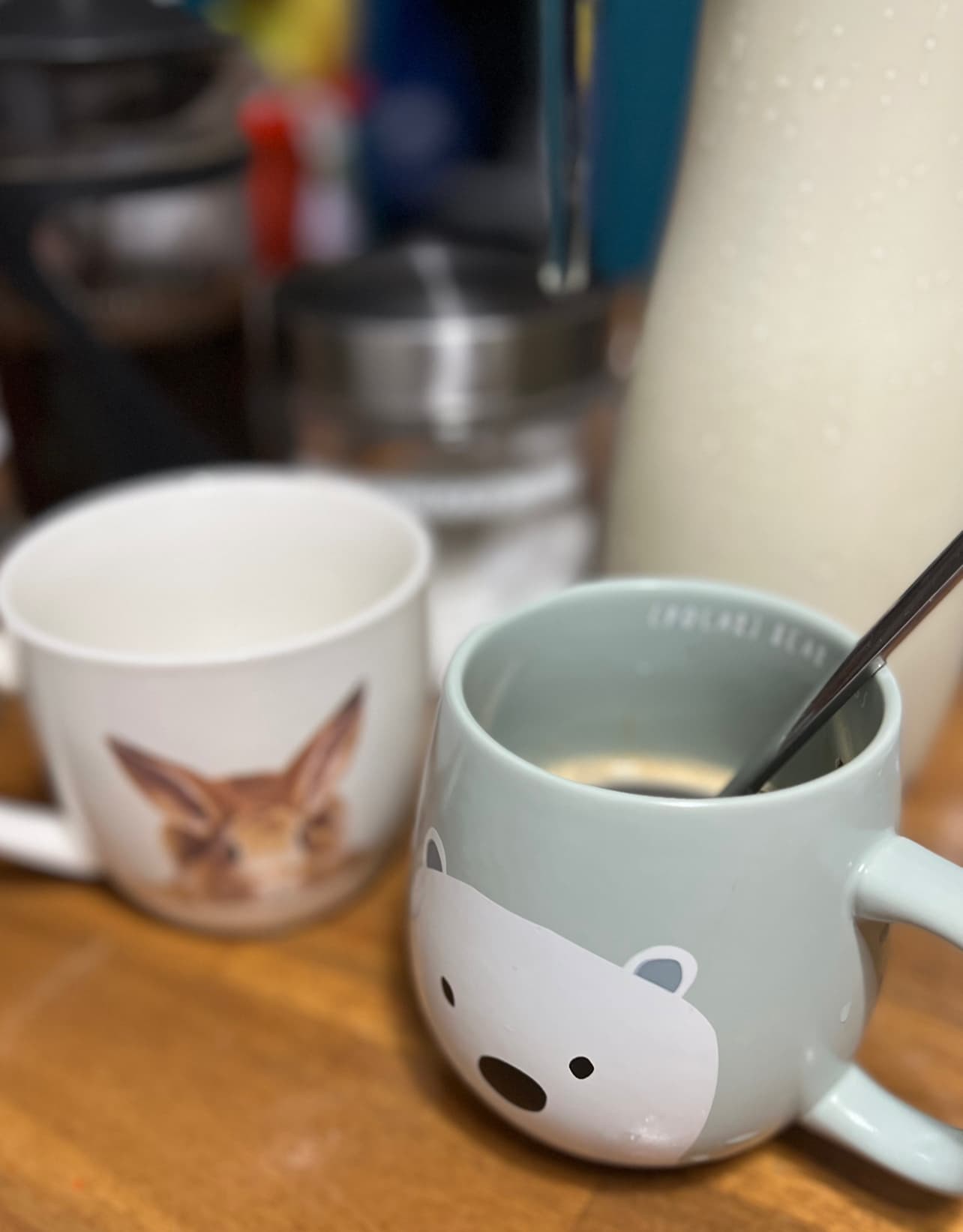 Tasting a new hazelnut instant coffee I found on the kitchen counter. The French press has Vietnamese coffee simmering away inside. Excuse the jug of milk- our pitcher is missing! And enjoy the cute animal mugs. (If anyone contributed to that forum meet up game, when you read my section, this’ll serve as proof that I do, indeed, collect cute animal mugs.)