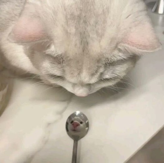 Sorry to disappoint you, but that’s not a reflection of the kitty, it’s a reflection of a mouse. The mouse probably took the photo. It’s just playing with the kitty to show dumb cats are.