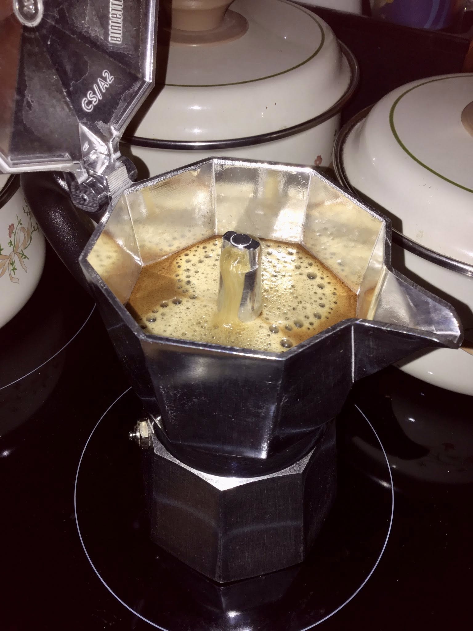 A Bialetti moka pot coffee maker on a stove top. As the bottom of the aluminium moka pot heats up coffee bubbles up into the serving chamber above. In the picture the moka pot lid is open so we can see the coffee emerge. At the point when the picture was taken it is getting quite full with strong bubbly coffee.